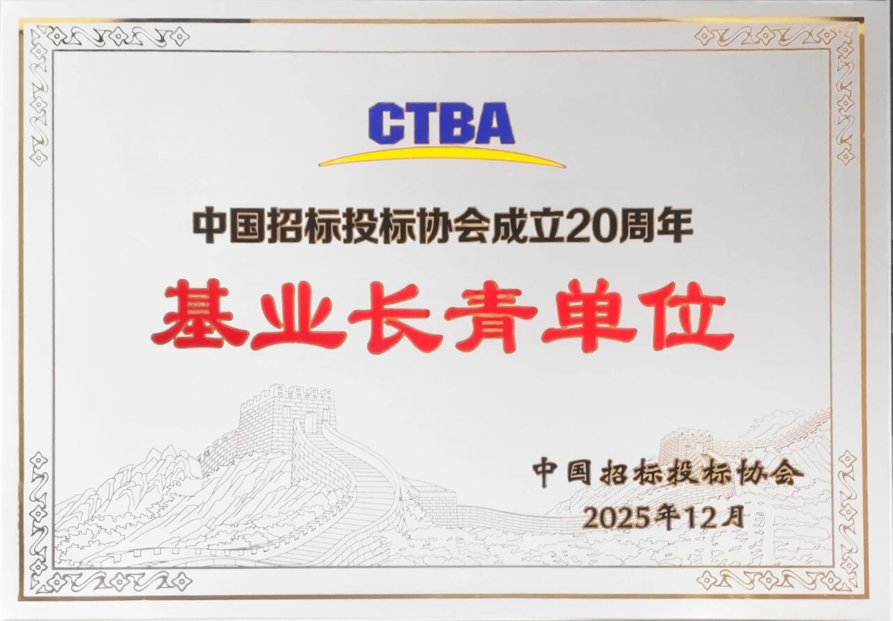 在中國招標投標協會成立20周年暨《招標投標法》實施25周年之際,我公司憑借深耕行業的堅守與卓越貢獻,榮獲“基業長青”重磅榮譽,載譽前行!